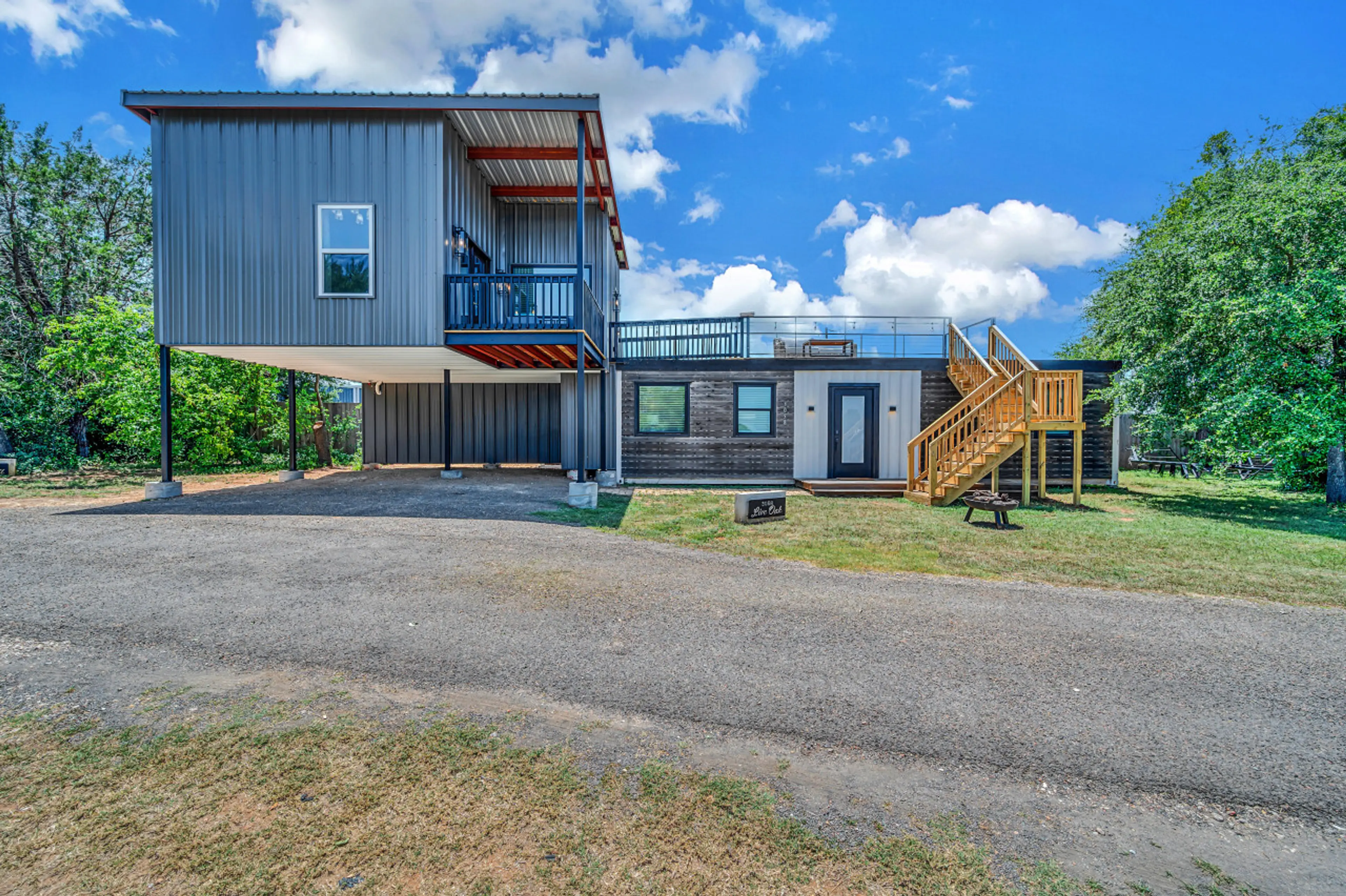 Retreat to Live Oak at Bluebonnet Trail where nature meets luxury. Discover our unique property showcasing an upstairs primary suite with a plush king bed with a private balcony and living space. Access this one-of-a-kind experience effortlessly by using the rooftop patio or via the innovative ladde...